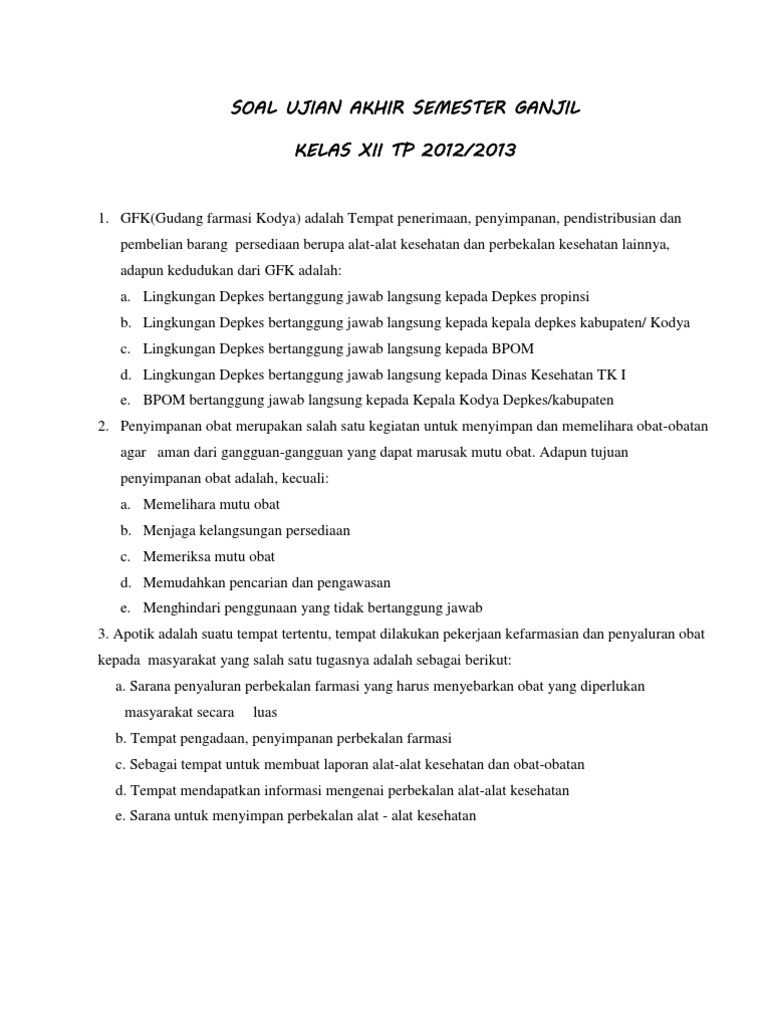 Pada kesempatan kali ini, admin akan membagikan latihan soal pilihan ganda mata pelajaran pelayanan farmasi / ilmu resep untuk smk farmasi kelas 11 semester 2 kurikulum. Sunday, november 4, 2018 add comment edit. November 20 2019 oleh smk dipo. Contoh soal dan pembahasan uas kimia kelas 12 semester 1 chemistry is fun. Pembuatan termasuk pengendalian mutu sediaan farmasi, pengamanan, pegadaan, penyimpanan dan pendistribusian atau penyaluran obat, pengelolaan obat, pelayanan obat atas resep dokter, pelayanan informasi obat, serta pengembangan obat, bahan obat dan obat tradisional merupakan pengertian dari ….